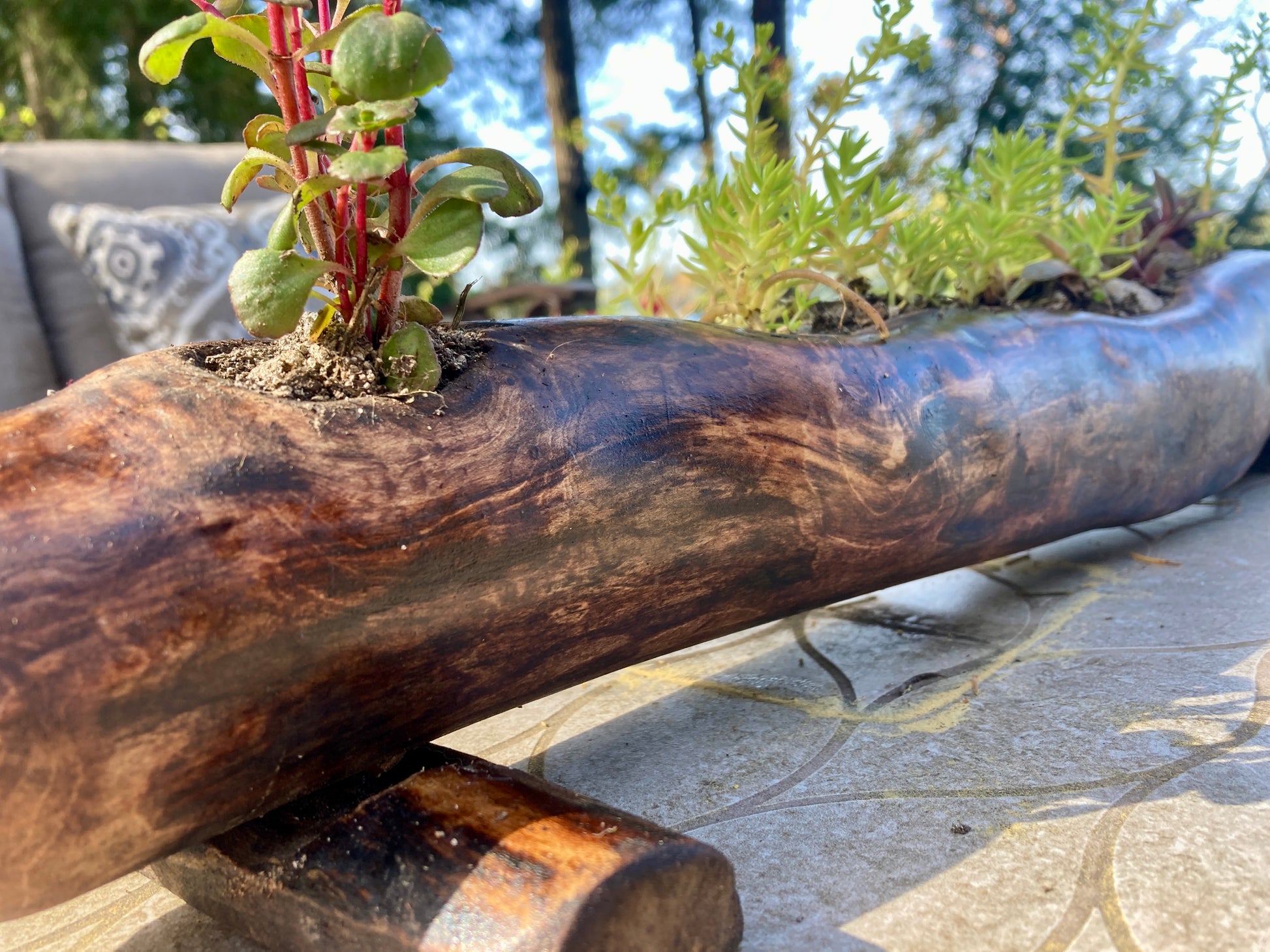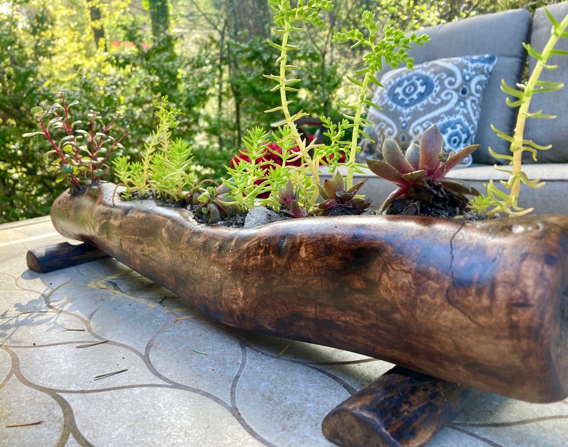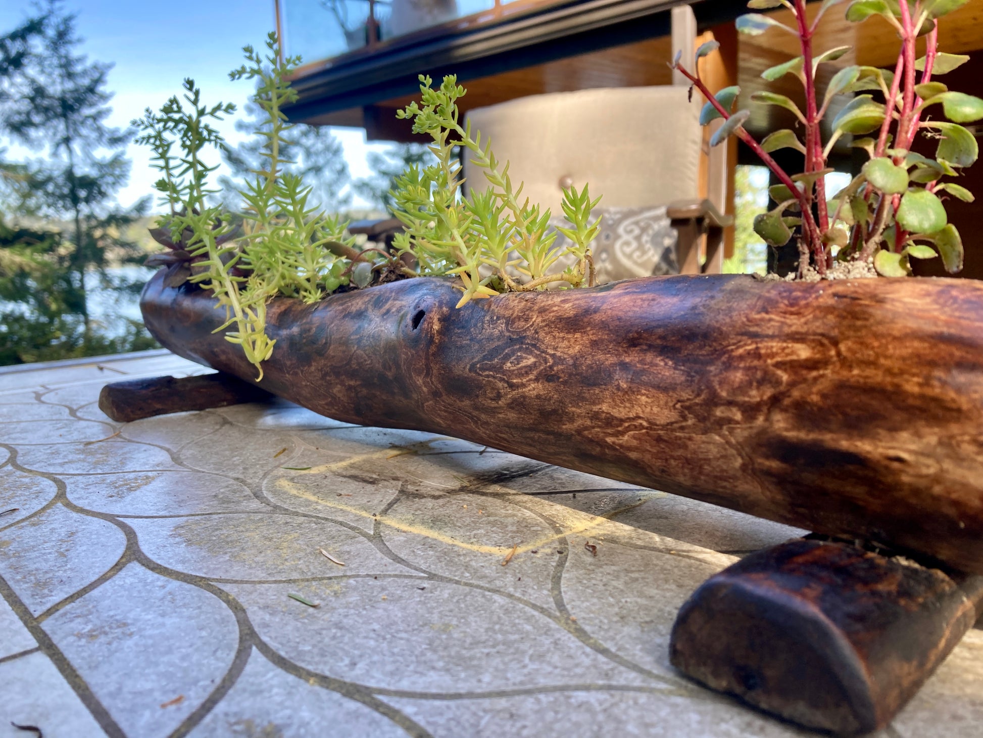 Foraged storm debris; carved, hollowed, sanded, and finished. Maple limb converted into succulent planter.