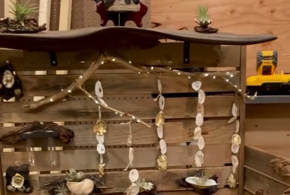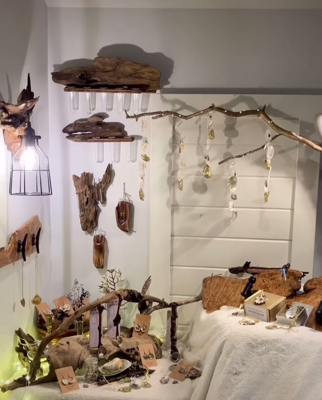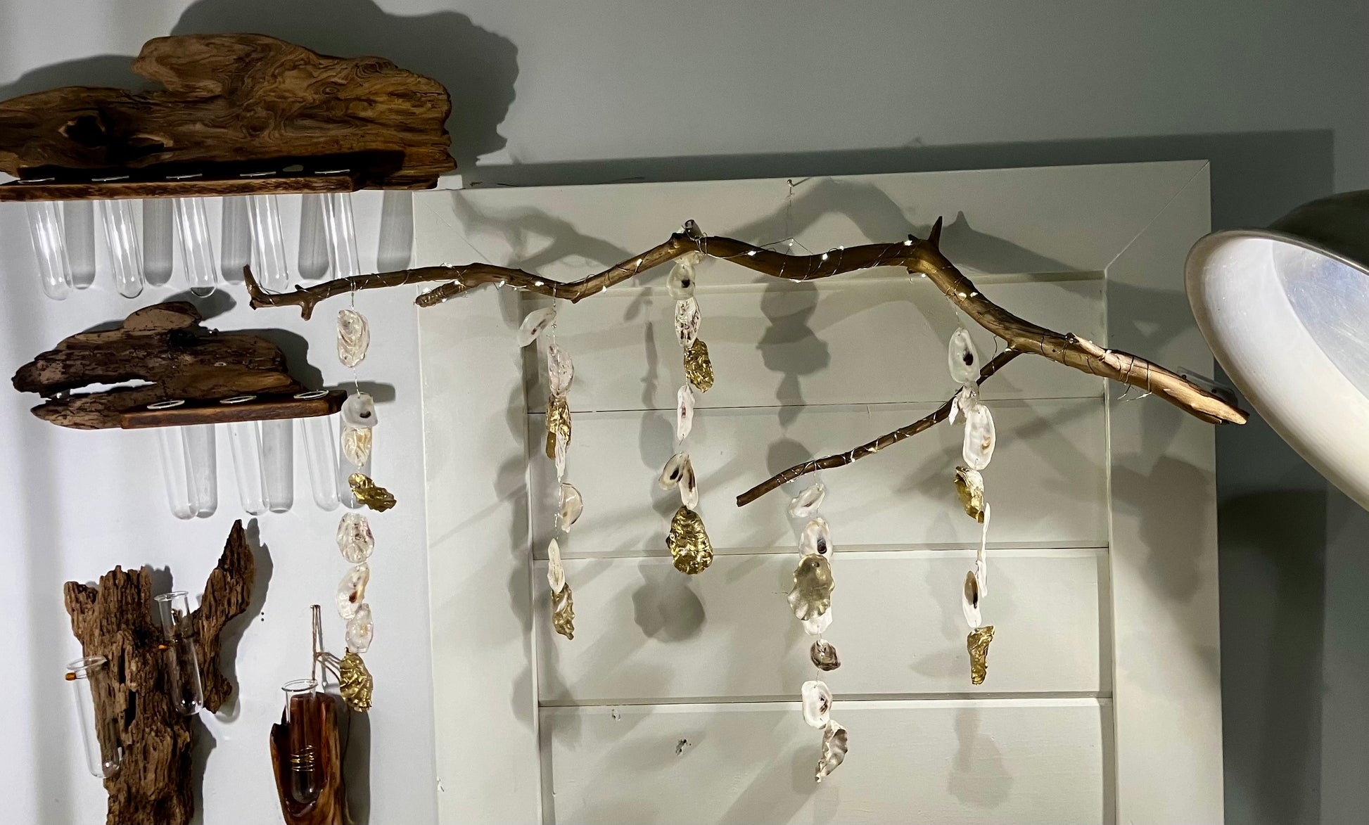 Attracting attention to its unique features, the driftwood supports five strands of oyster shells. Each strand offers a harmonious blend of gilded cups, lustrous flats, and pearl beads, crafted to capture and reflect ambient light, casting mesmerizing patterns throughout your space.