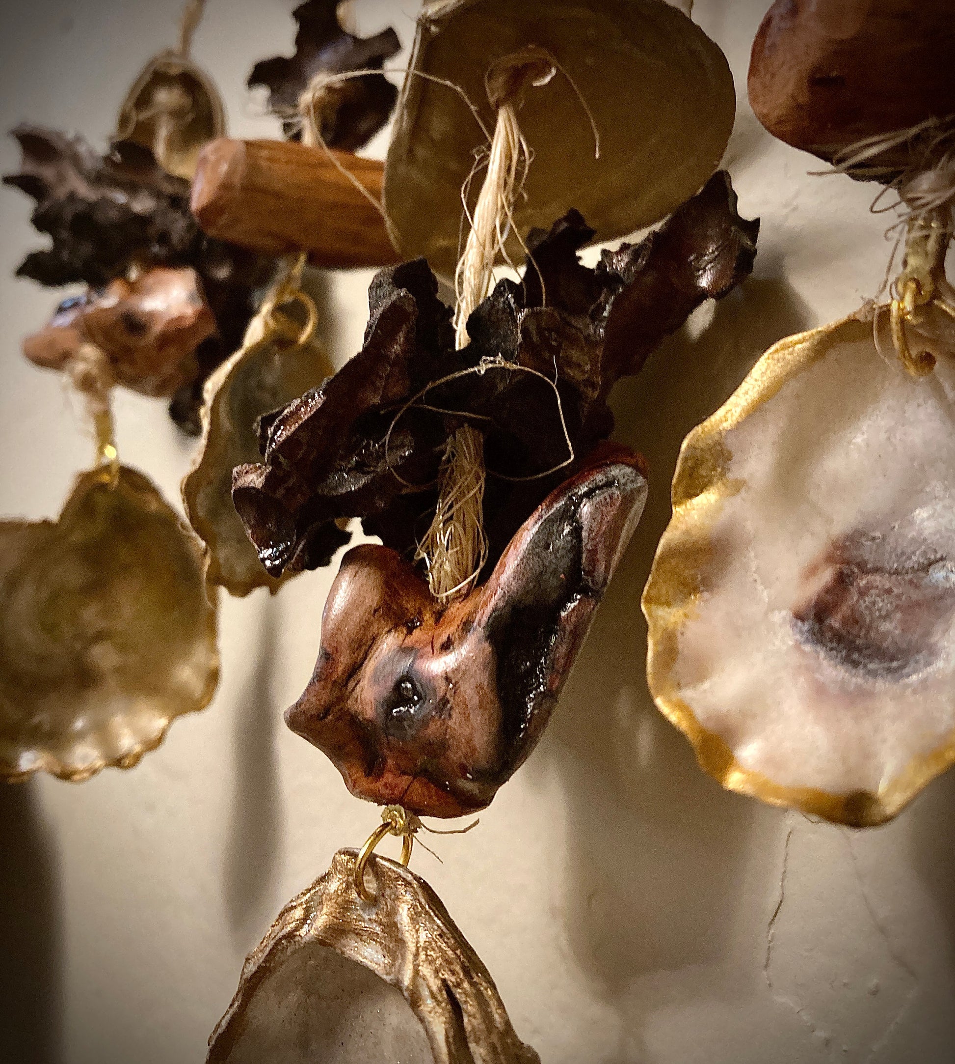 A beautiful homage to the beaches of the Puget Sound, this mobile is exquisitely crafted with every detail attended to. The organic materials featured are: honeycombed driftwood, hand-carved Madrona driftwood beads, polished and gilded Olympia Oysters, and gold painted clam shells. Each strand is attached to the Madrona driftwood host via gold plated jewelry hardware. The jute twine and the driftwood host received an "antique gold" rub to bring a vintage nautical element to the piece.