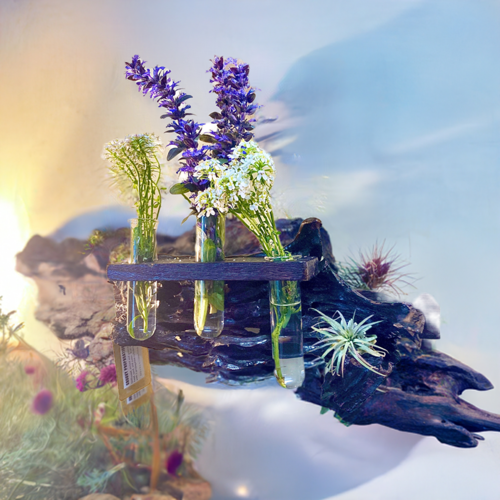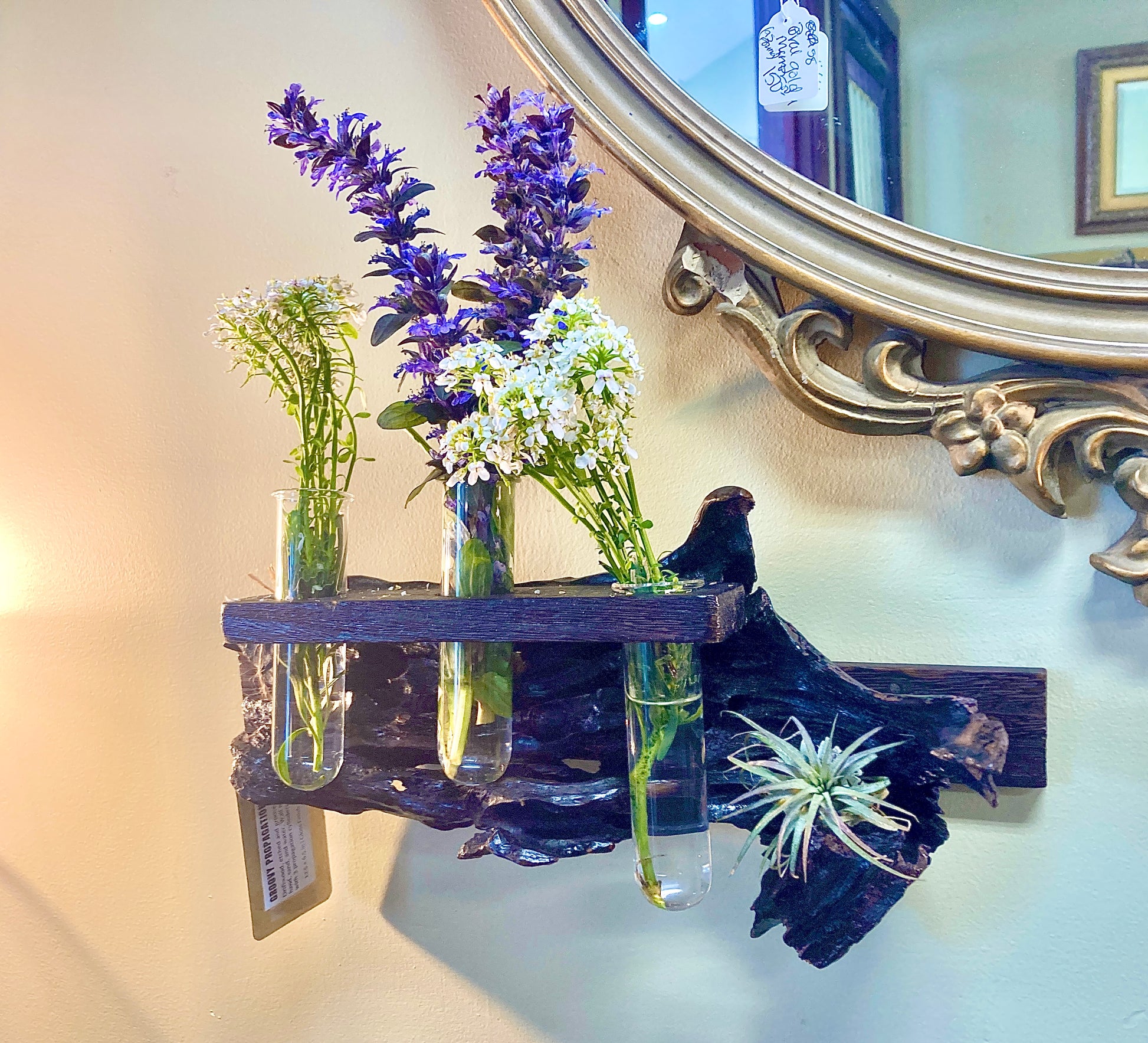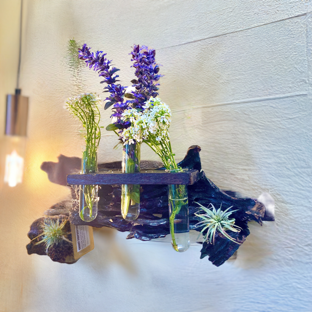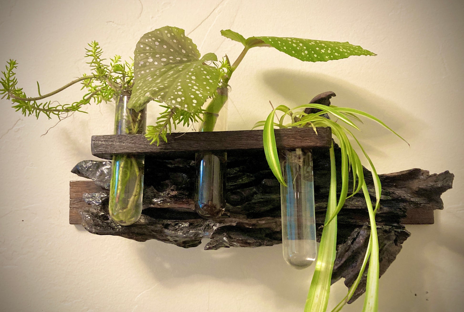 Driftwood, etched and grooved by hand, sand, and water. Wall mounted with 3 propagation cylinders.