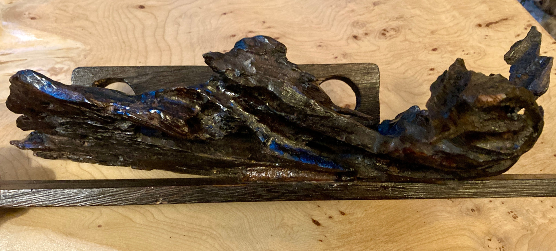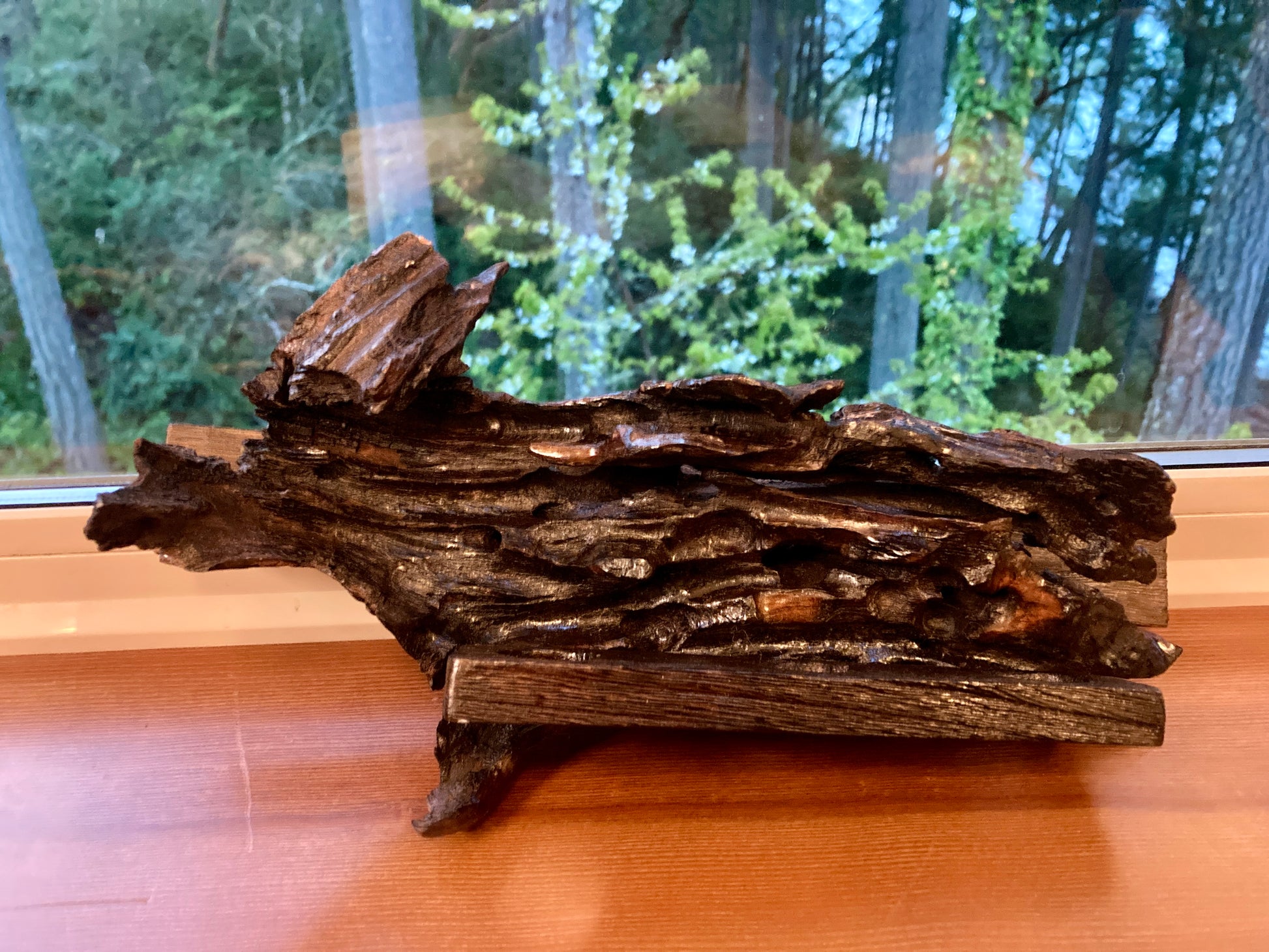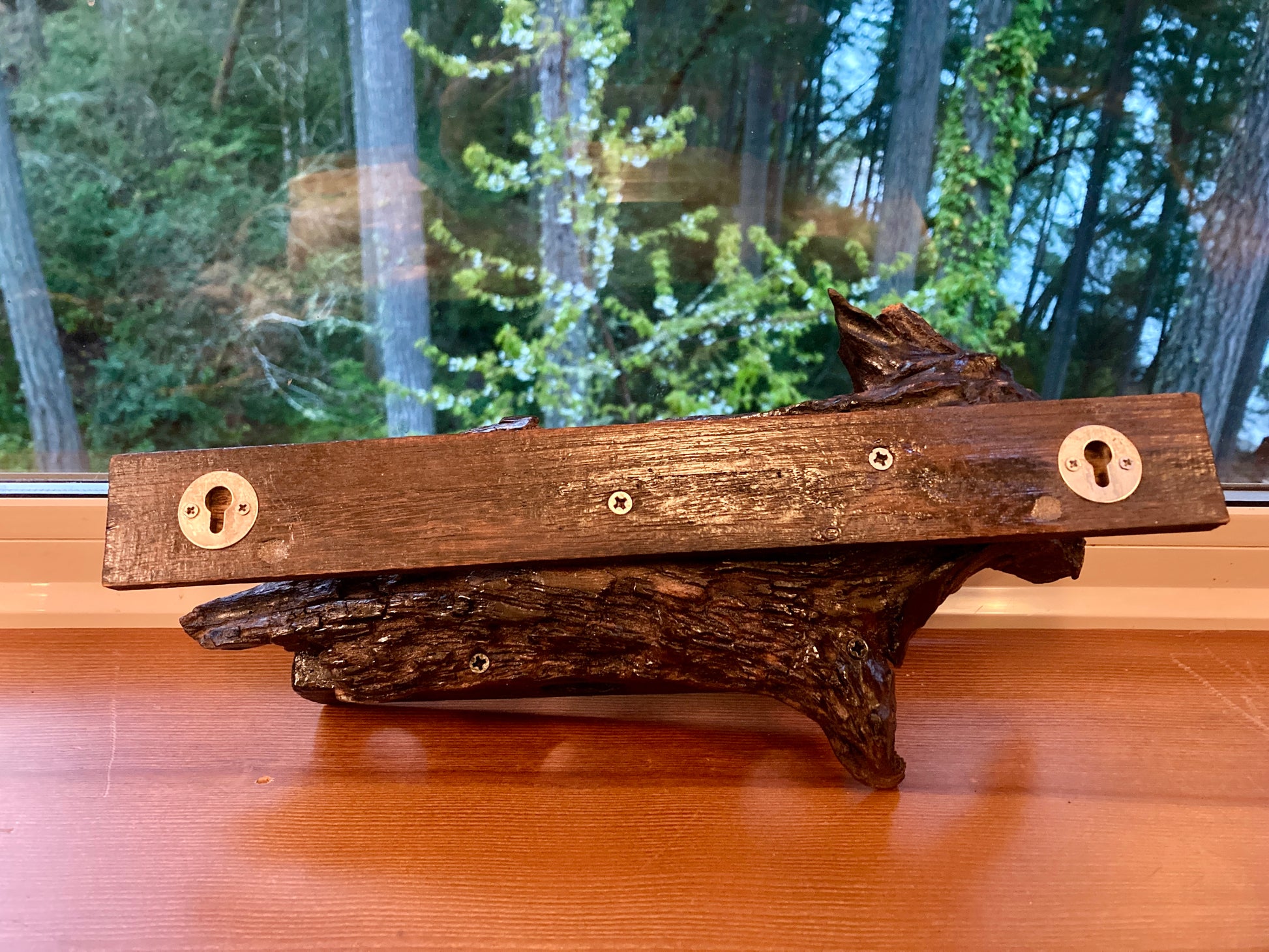 Driftwood, etched and grooved by hand, sand, and water. Wall mounted with 3 propagation cylinders.