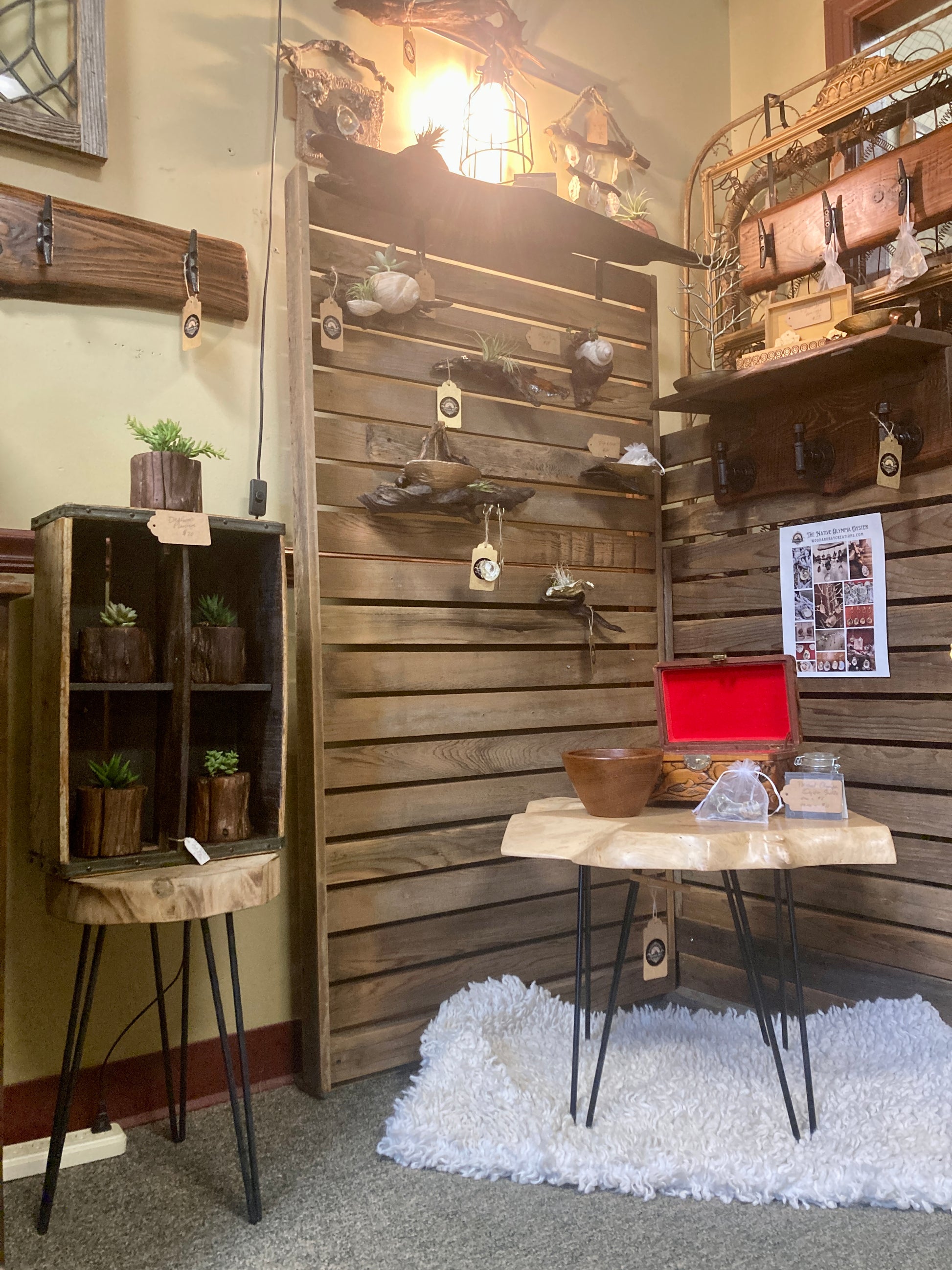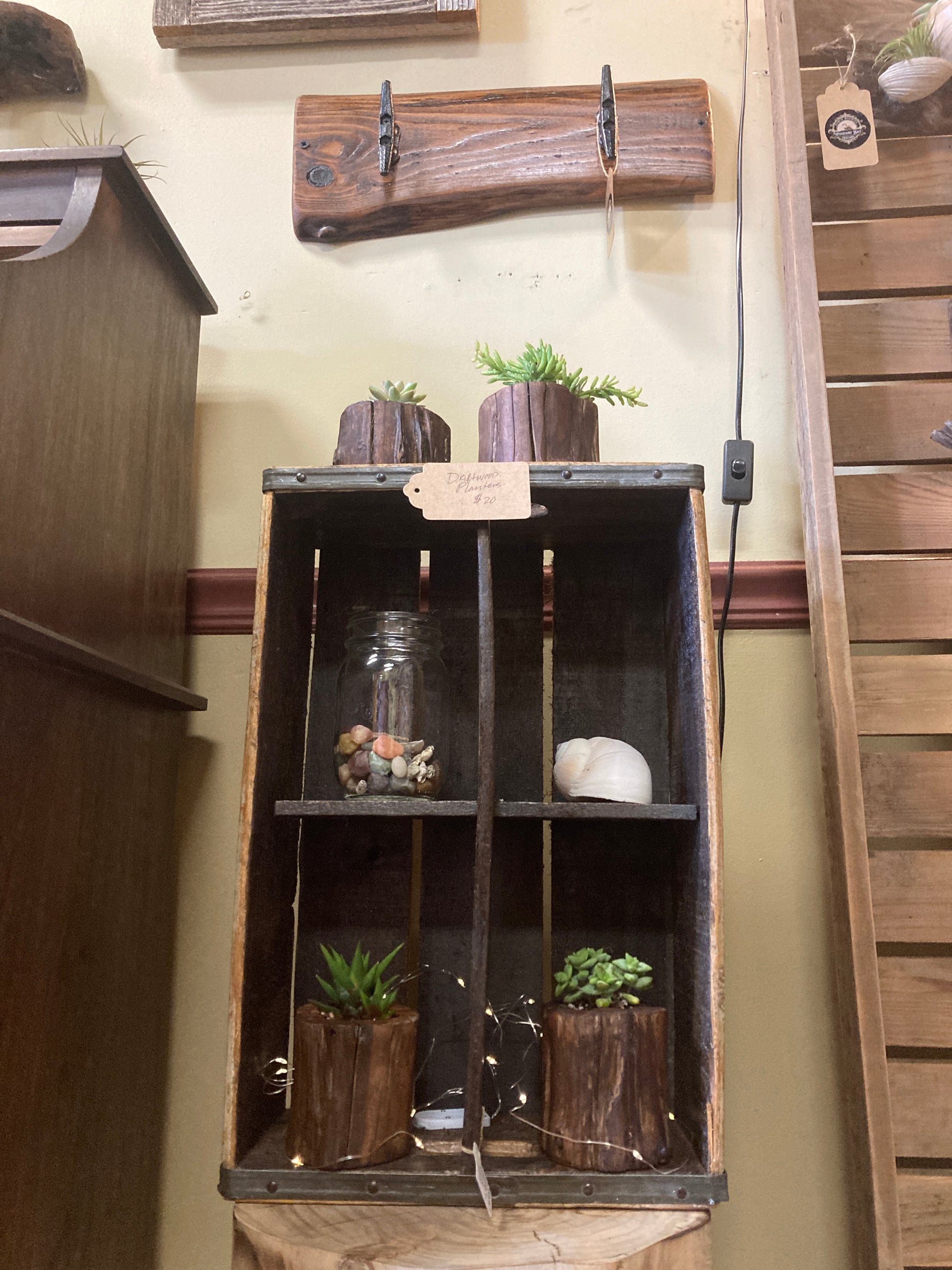 Live edge Maple with mahogany stain and gloss finish. Two black boat cleats, 4" in length, serve as hardware for hanging.