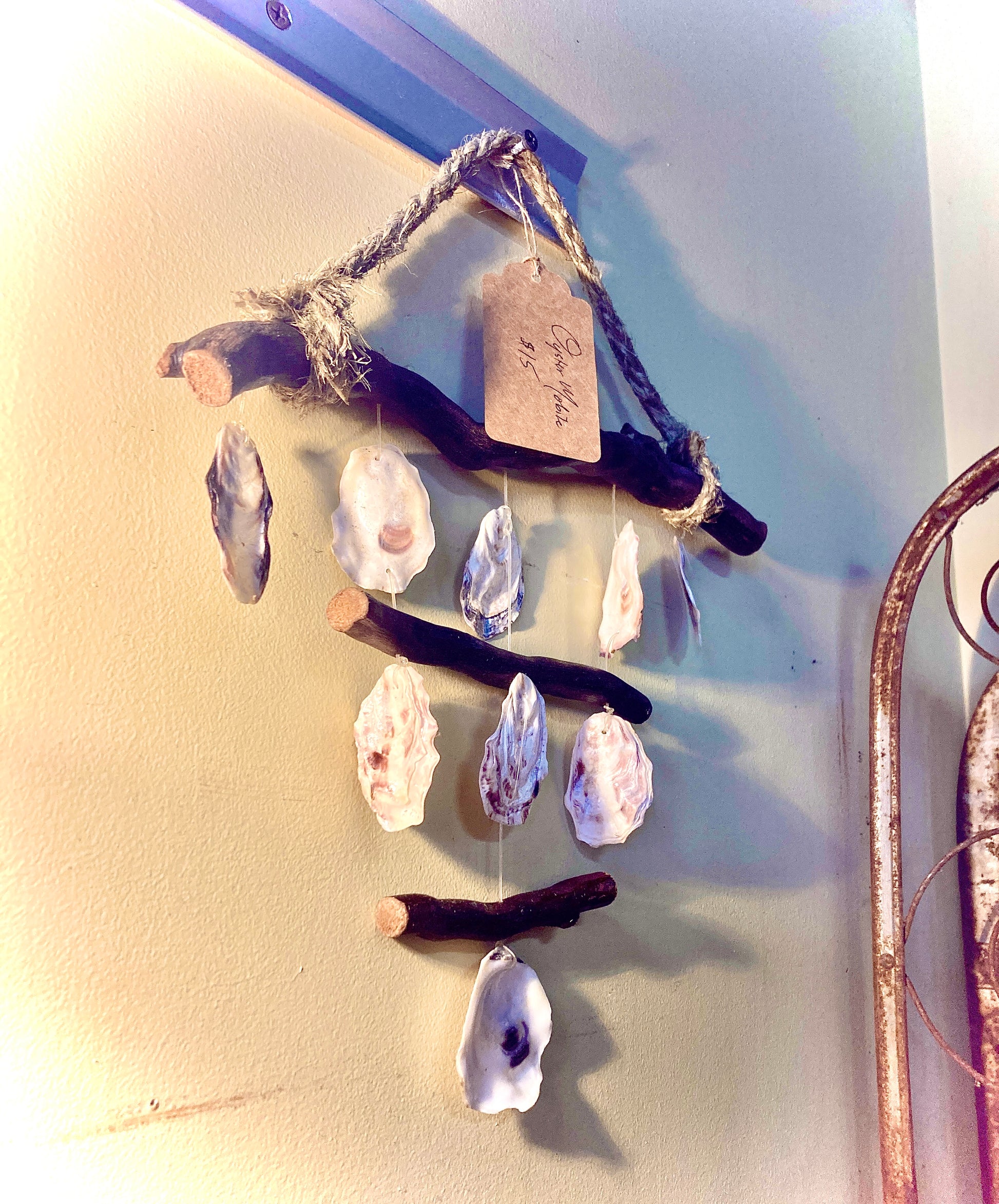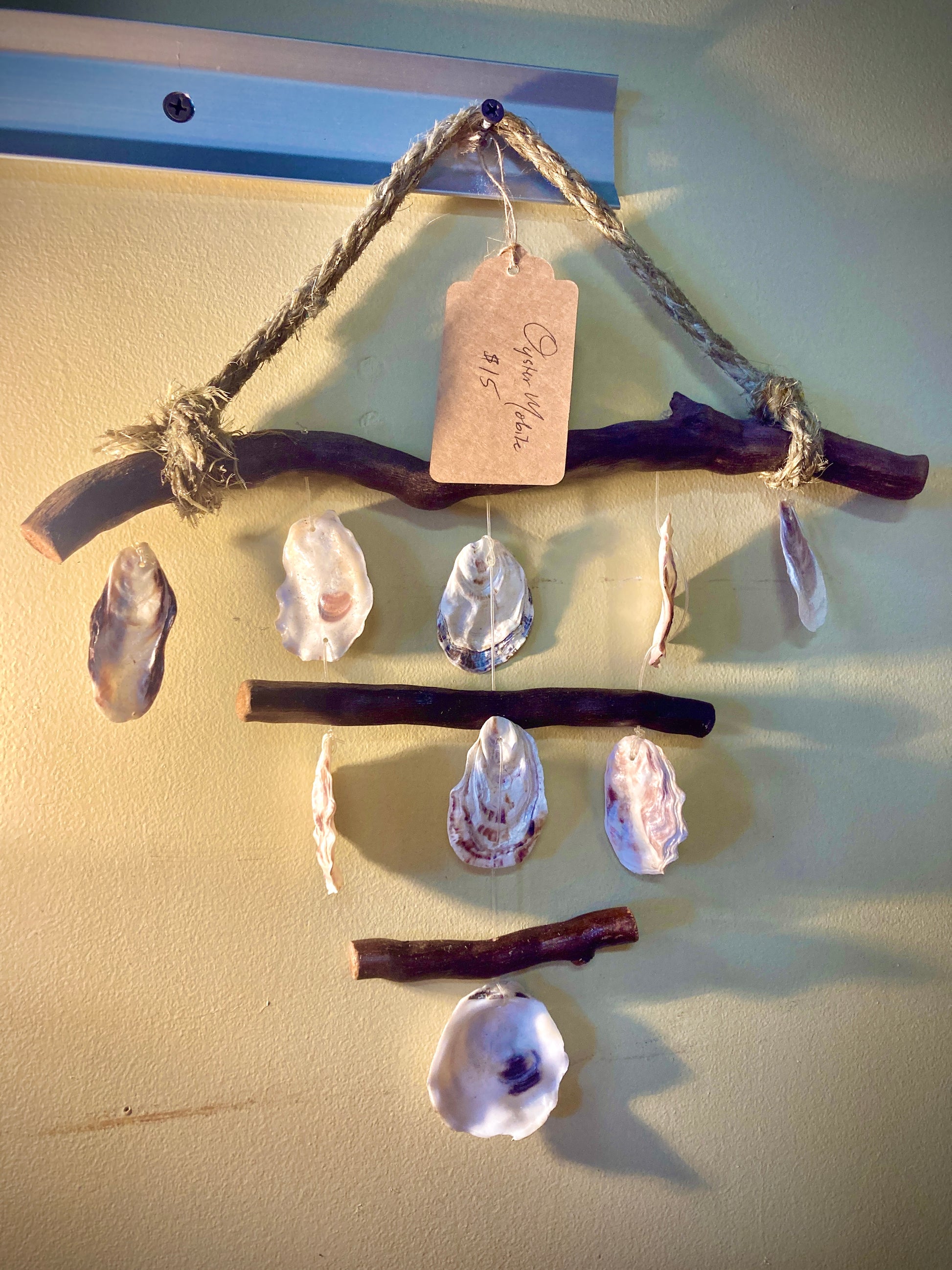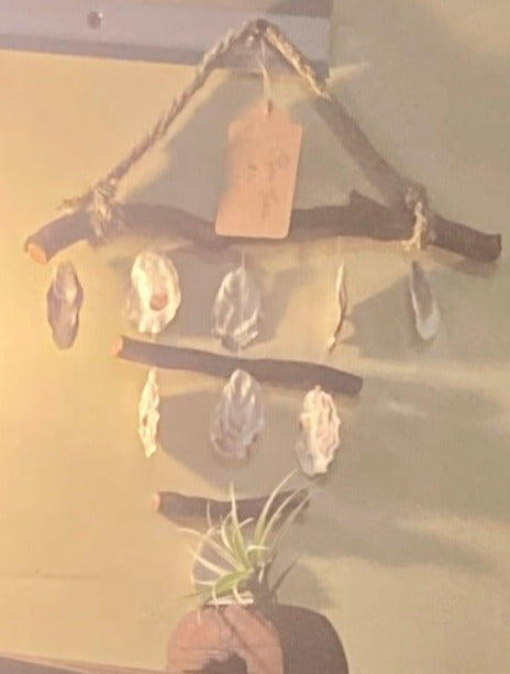 Sparkling flat oyster shells adorn this Madrona limb coastal mobile. Fun, weathered boat rope creates an authentic vibe. Can be hung indoors or out.