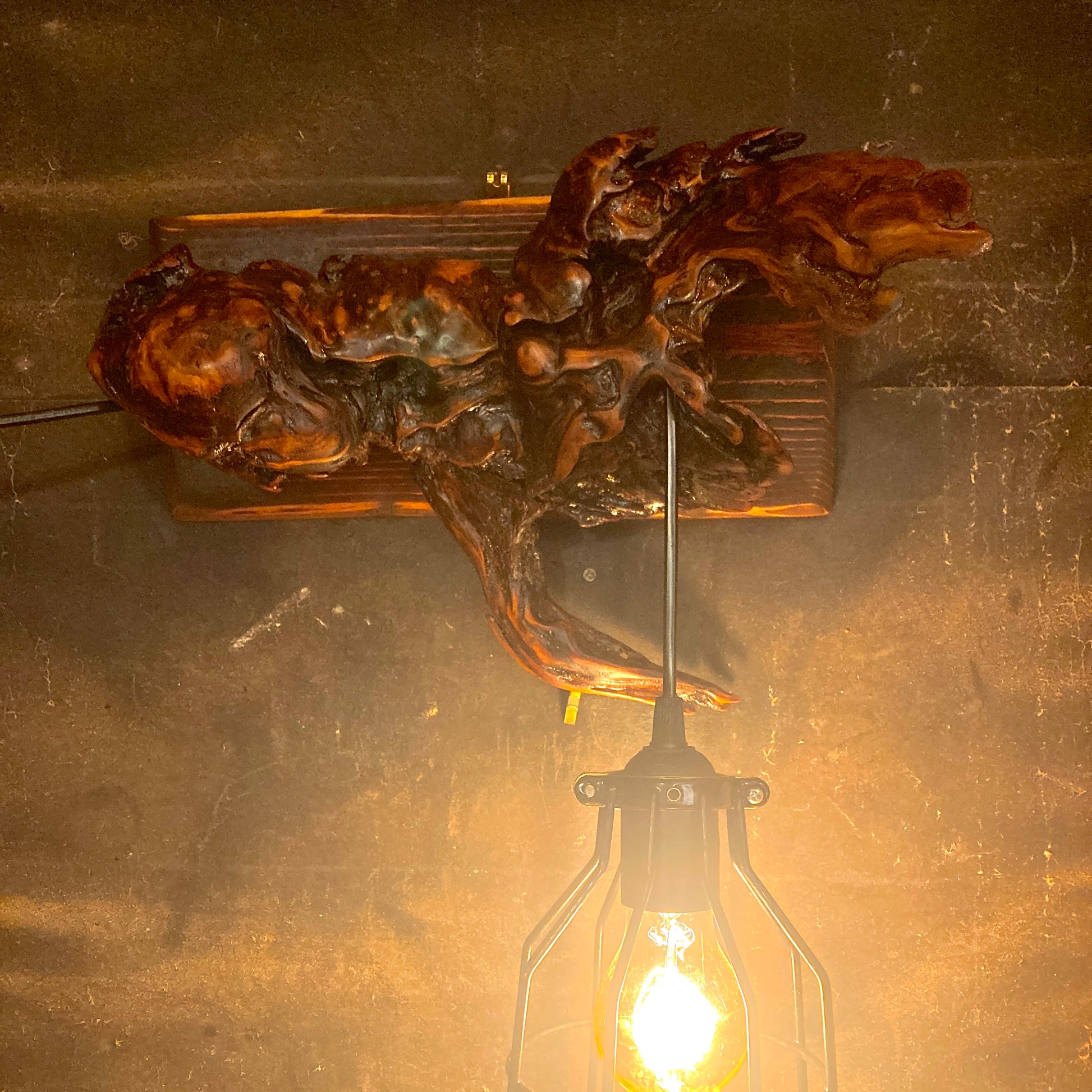Burled Driftwood Pendant Light – Coastal charm and industrial elegance, inspired by the serene beauty of the Pacific Northwest. This unique wall-mounted piece seamlessly marries a touch of nautical allure with sustainable craftsmanship, creating a statement fixture that illuminates your space with style.